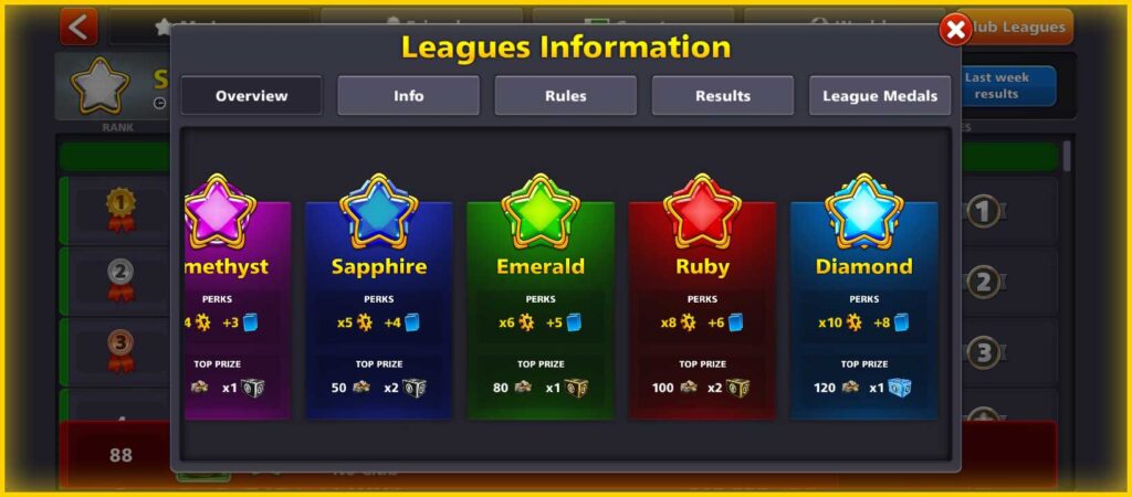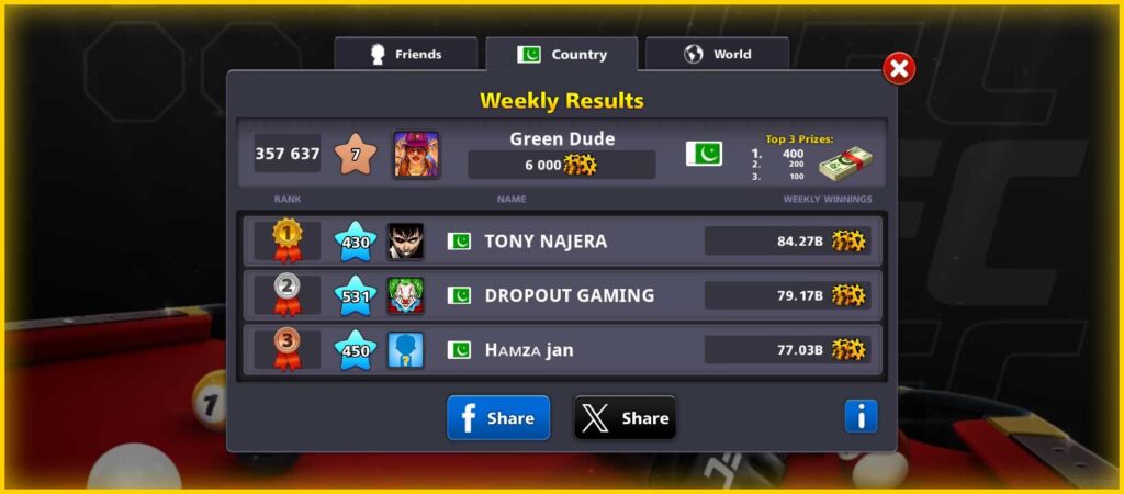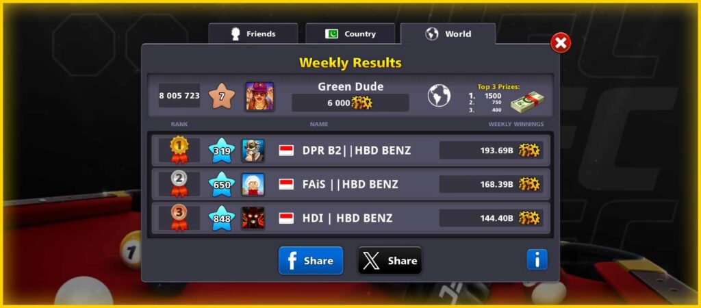 8 Ball Pool hosts weekly competitions divided into different categories. By winning, you can earn Cash, Coins, and Boxes.