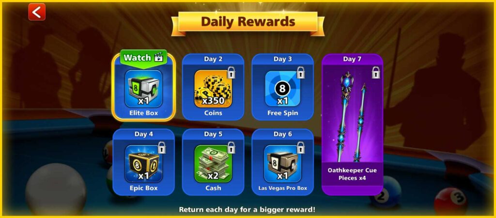 The game allows players to collect free rewards. By watching a short ad (around 30 seconds), you can claim rewards such as Cash, Coins, Free Spins, Cue Pieces, or Boxes (Rare, Epic, Pro). This method is simple and quick, especially for new players.