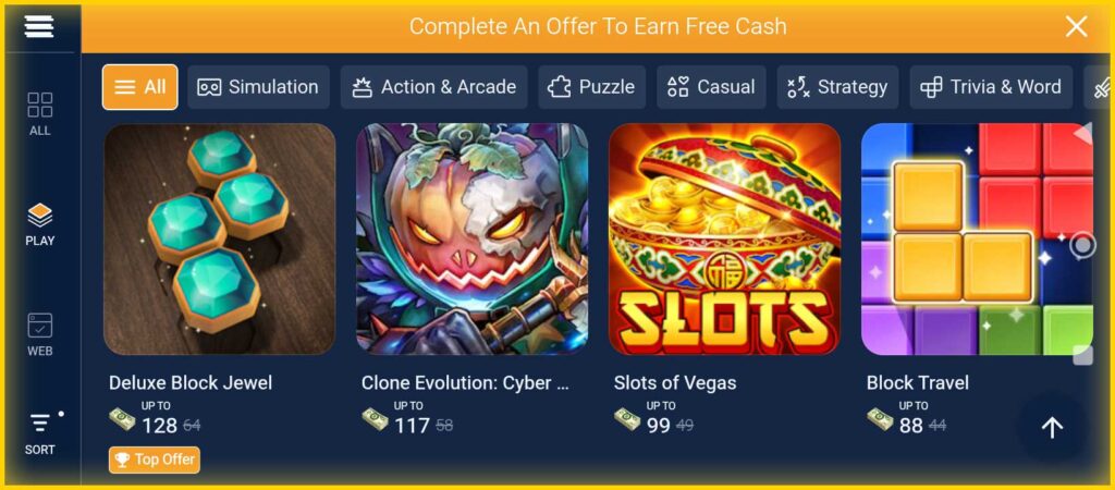 In the “Free Cash with Offers” section, you’ll find various tasks like installing an app, completing a survey, or signing up for a service. Each task has different rules and rewards. For example, completing one offer can give you up to 128 Cash. This method takes more time, but it’s worth it if you need extra cash.