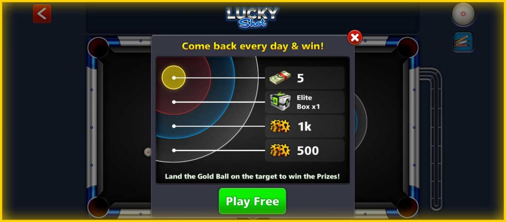 Every 24 hours, the game gives you a chance to take a Lucky Shot. If you aim correctly and pocket the ball inside the yellow circle, you get 5 free Cash as a reward. There’s only one try, but with good practice, you should never miss this daily bonus.